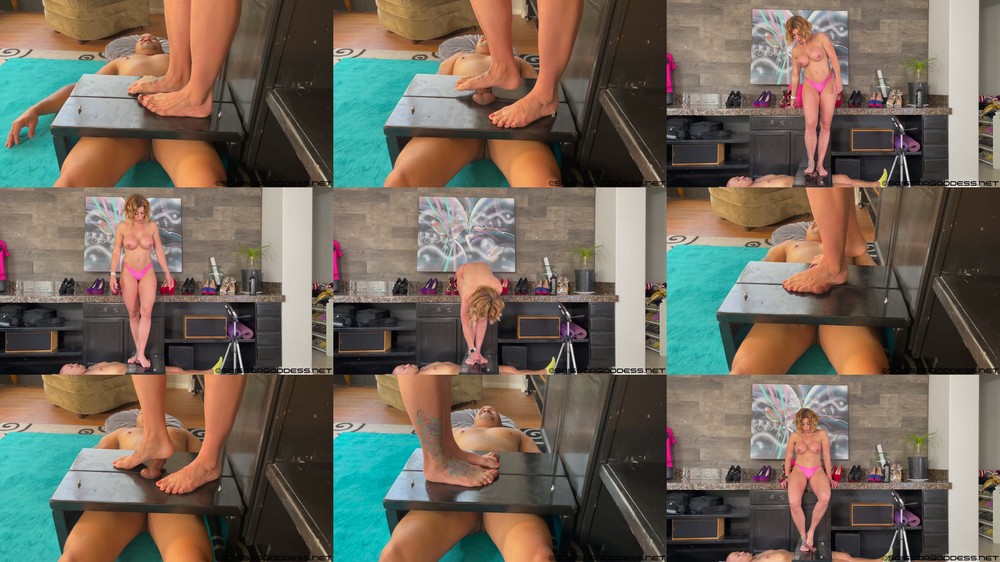 Video Description: Rapture’s new cock box came, and she’s excited to try it out. This custom made box keeps the cock and balls tightly in place, and Rapture steps up onto it with a smile. She uses her 190 pound Muscle Goddess body to stand on her slave’s cock. His hard cock painfully bends and resists the weight of