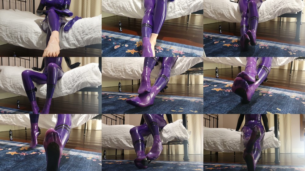 Video Description: This clip is 9.30 minutes long, and there's so many beautiful views of my feet and amazing rubbery sounds.I'm wearing my transparent purple catsuit, this video is filmed from your POV which is obviously under me, kneeling on the floor by my feet (where all footboys belong) Become my foot boy in
